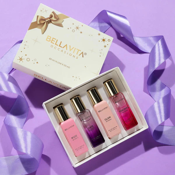 Bella Vita Luxury offers a curated gift set of our best selling perfumes - For Her. A set of 4 miniatures, arousing your olfactive experience right from fruity, floral through to Oriental Woody and sweet Oud, for all moods. A compilation of Date Woman, Glam, Rose & Senorita woman ; why compromise when you can have all 4, easy to pop in your handbag at all times!