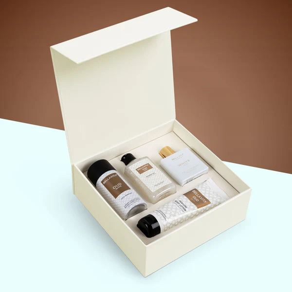 Activate the zen mode in you with our dynamic OUD WHITE Premium Gift Set. This special collection has four must-haves to take you on a peaceful journey. Enjoy the delightful scent of the OUD WHITE Shower Gel with Aloe Vera. Moisturise your skin with the calm energy of OUD WHITE Body Lotion, enriched with Argan Oil, Shea Butter, and OUD WHITE perfume. Freshen up with the subtle OUD WHITE Deo Parfum and smell wonderful all day and all night with the OUD WHITE Eau De Parfum. Embrace a refreshing aroma that radiates tranquillity, and peaceful vibes wherever you go – perfect for a peaceful getaway whenever you want!