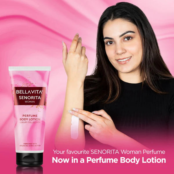 Discover the fun side of you with SENORITA Woman Perfume Body Lotion. Enjoy the amazing scent of SENORITA Woman perfume in this lotion, with a mix of Shea Butter and Argan Oil to make your skin feel great. This lightweight lotion hydrates your skin, getting you ready for a romantic day ahead. Treat yourself to a lovely experience and let the SENORITA Woman Perfume Body Lotion be part of your daily routine.